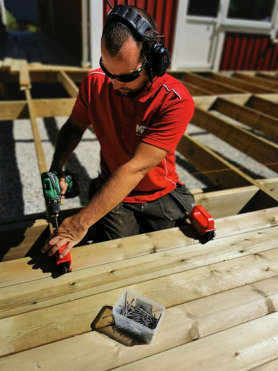 2. Fest skruen på hver side av terrassebordet/planken med det spesialdesignede TX15-bitset. Når bitset stopper mot monteringsverktøyet har skruen riktig monteringsdybde, og du er du ferdig med monteringen.
