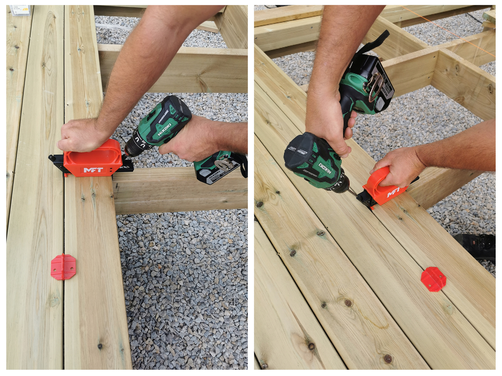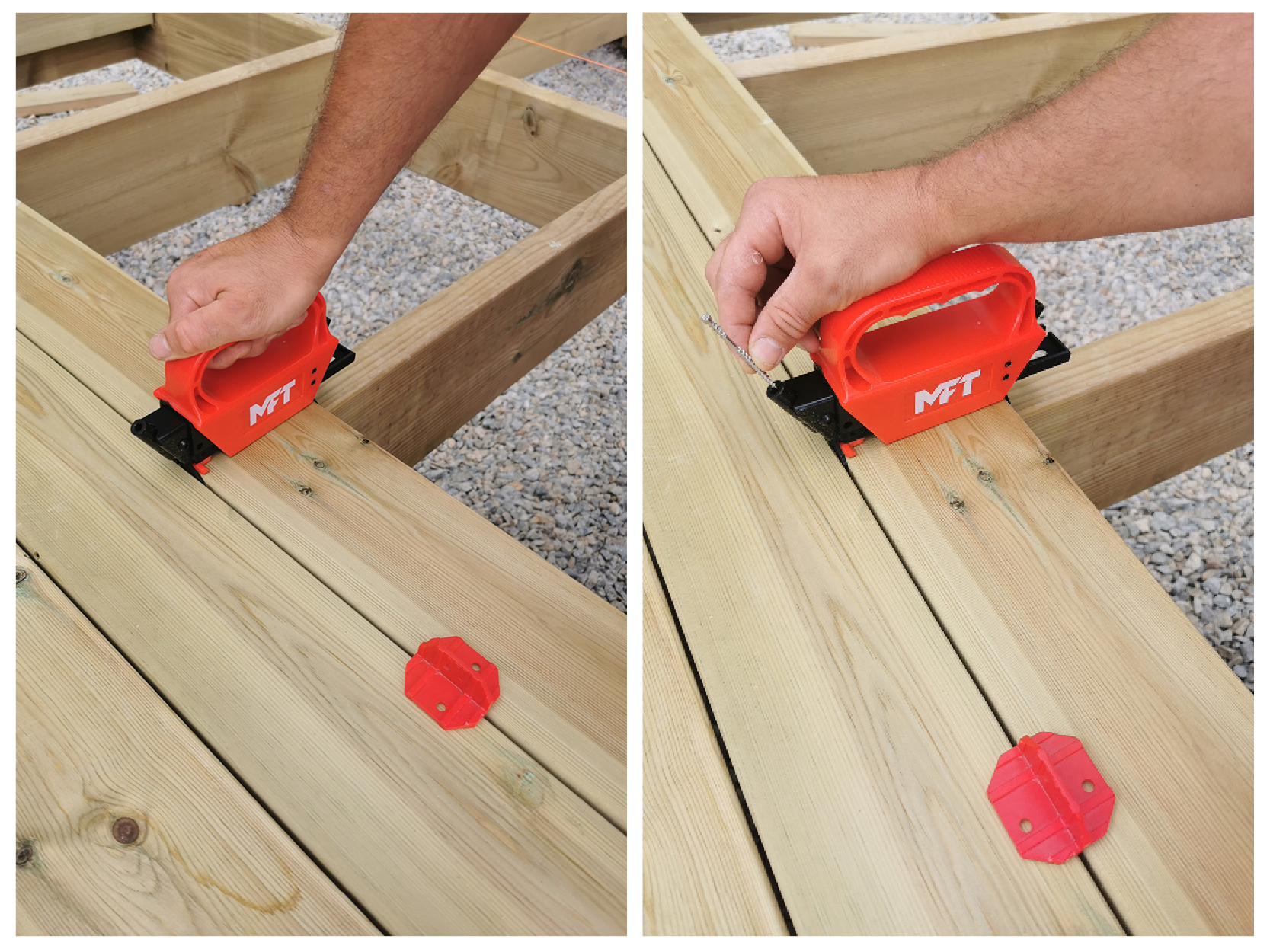 1. Klem fast monteringsverktøyet på terrasse- bordet/planken. Plassér en skrue i hvert monteringshull på verktøyet.